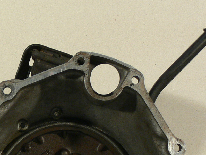 Recht einfach lässt sich bestimmen ob das Getriebe überhaupt für den 3L Motor gebaut wurde. Der 3L Mitsubishi-Motor hat den Anschluss für den Kühl-Wasserschlauch zwischen den Zylinderblöcken in Richtung Getriebe abgehend. Dieser Anschluss wird oben durch das Getriebegehäuse geführt. Ein LeBaron-Getriebe muss also auf jeden Fall einen runden Durchbruch am oberen Rand haben. Weder die Getriebe für den 3,3L- noch den 2,5L-Motor haben diesen. Außerdem ist das Gehäuse an mehreren Stellen mit dem Code 631 versehen.