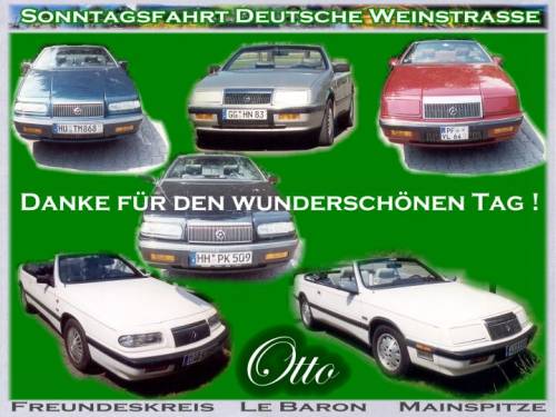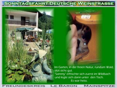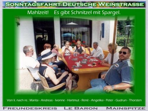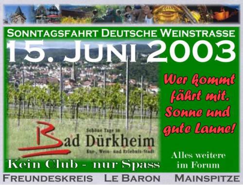 Eine junge Polizistin schaut zu. Der letzte Ort vor Bad-Duerkheim ist gesperrt, ohne Vorwarnung. Ich steige aus und frage. "Jo, die hawwe es Umleidungsschild geklaut! Fahrt ner reschts rum, do gehts weider!" Die letzten 10 km haben fuer alles entschaedigt: rechts ein Steilhang, Sandsteinfelsen und Wald, links oben eine schier unglaublich grosse Festung (Ruine), aus Sandstein gebaut. Wenn man sich das alles anschaun wollte wuerde es eine Woche Urlaub kosten. Die Zweige der Baumallee beruehrten sich ueber der Asphaltstrasse. Es war wie im Film. Mittagspause im Waldgasthof. Die Heimfahrt war auch schoen, Highway-Chruise. Unterwegs immer wieder ein Winken, die Freunde zerstreuten sich in Richtung nach Hause. Peter aus HH ist mit Rene und mir mitgefahren auf die Maar-Aue, im Rhein, in Mainz-Kostheim, rechte Rhein-Seite. Von der Terrasse ein herrlicher Blick auf "des goldische Meenz". Der Vater Rhein trennte uns von der Stadt. Uebrigens, die Wettervorraussage war falsch: kein Tropfen! Man kann nicht alles aufschreiben. DIE ERINNERUNG BLEIBT ! Man hat nette Menschen kennengelernt, von denen man nur den Internet-Namen gewusst hatte. DANKE, danke Euch Allen, Otto