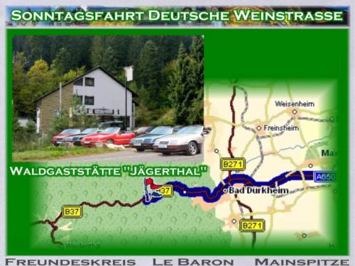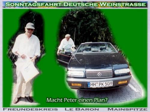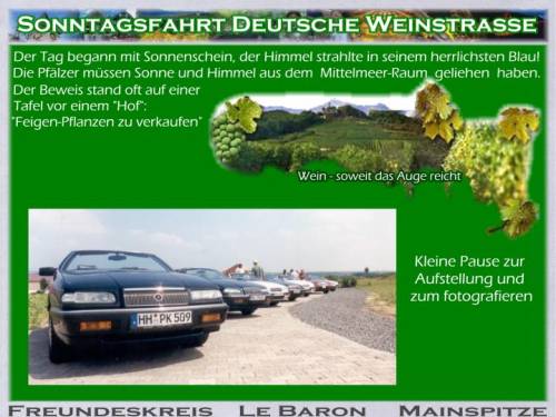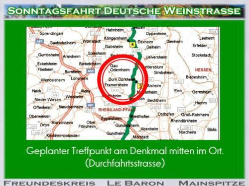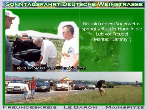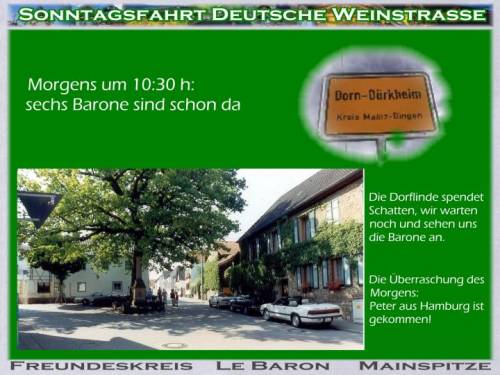 Um 9:53h faengt Gudruns Handtasche an zu vibrieren. Das Handy ist in Aktion. Zwei mal falschen Knopf gedrueckt aber es piepst immer wieder eine spanische Melodie, dabei sind wir in der Pfalz. "Sedlatschek": es ist der Thorsten. "Ist das Treffen abgesagt?" - "Nein, nein, sind gleich da, noch 5 km.". Thorsten war der erste am Denkmal. Malerisch gelegen unter der Dorflinde die es gut mit uns meinte und Schatten spendete. Blauer Himmel - Traumwetter. Fuer Nachmittag war Gewitter angesagt. 10:30h gehts los, 3 Barone kommen und nochmal zwei, Super! Mit sieben Wagen gehts puenktlich um 11:00h los. Durch die Pampas: keine Leitplanken, Landstrasse ohne Nummer! Unterwegs bietet sich neben einem Verkaufsstand ein Parkplatz an. Es kommt auch gleich ein Ortsansaessiger (wollte eigentlich("Eingeborener" schreiben): "Dess Grundstick is awwer brivat"! Nach einer Foto-Session gehts weiter. Die Mainzer verabschieden sich, sie fahren mit den Kindern ins Schwimmbad. Mitten in einem Ort Baustelle. Die rechte Strassenhaelfte ist aufgerissen. Alle 30 Sekunden kommt ein Rad-Rennfahrer. Ab und zu darf ein Auto die Strasse ueberqueren. Einer von der Feuerwehr hat die rote Fahne in der Hand und markiert den "Herrn Wichtig".