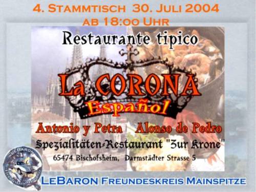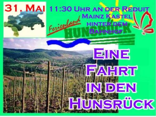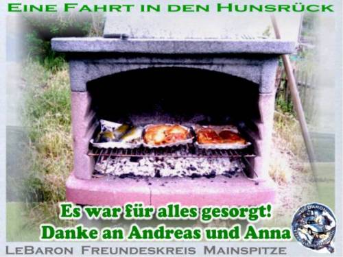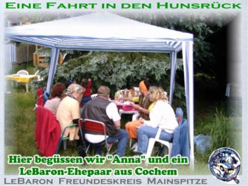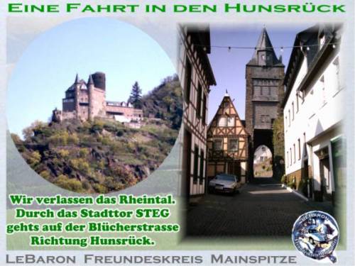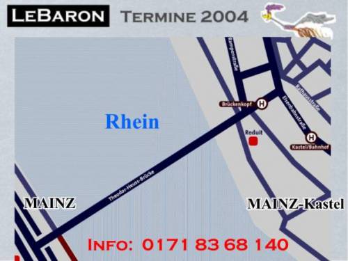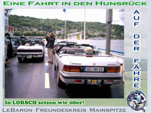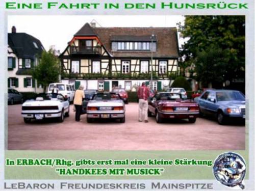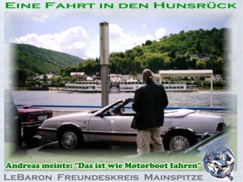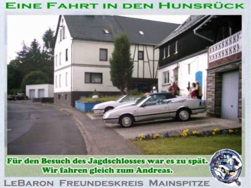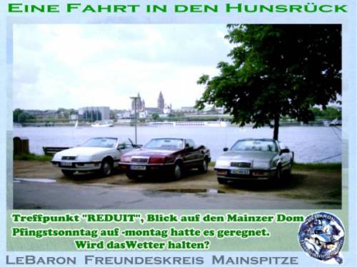Wir treffen uns am Pfingstmontag in Mainz-Kastel. 11:30 an der Reduit, das ist die alte Festung hinter dem Kasteler Bahnhof. Man kann vom Brueckenkopf der Rheinbruecke Richtung Schierstein - Wiesbaden fahren. Gleich links einordnen und dem Pfeil mit der Aufschrift Reduit folgen, oder links vom Bahnhof ueber den beschrankten Bahnuebergang. Es geht den Rhein entlang bis Erbach, kurze Rast. Weiter Richtung Ruedesheim, irgendwo mit der Faehre auf die linke Rheinseite bis Bacharach. Rast. Durch das Stadttor Steg durch die Hohle Gasse Richtung Hunsrueck. Besuch des Jagdschlosses Pleizenhausen. Anschliessend besuchen wir den Andreas in Pleizenhausen. Fuer ein Grill-Essen ist gesorgt. Auskunft: saxophonotto@compuserve.de Beste Gruesse Otto Nachtrag: Das Wetter hat bis in den Hunsrueck gehalten. Nach einem kurzen Regenguss konnten wir aber auf trockener Autobahn nach Hause fahren. Wir hatten auf Steffen aus Bad Duerkheim gewartet. Steffen von hier aus die besten Gruesse. Das naechste mal wirds wohl klappen. Ein schoener Tag wars. Diese kleinen Treffen helfen sich besser kennenzulernen. Es entstehen Freundschaften auf die man nicht verzichten sollte. Nochmals Dank, Andreas und Anna und Gruss an Euere Nachbarschaft. LeBaron Freundeskreis Mainspitze. KEIN KLUB - NUR SPASS Otto