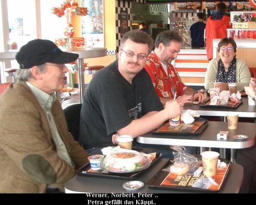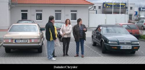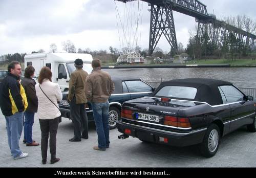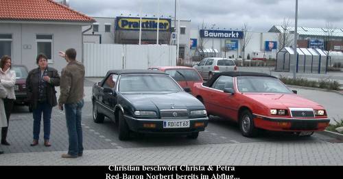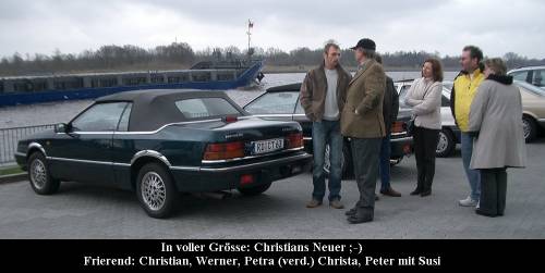 Um endlich den langen Winter vergessen zu machen, trafen wir uns - anlässlich des Besuchs von "Oberbaron" Peter KA und Susi in Norddeutschland - in Rendsburg. 28. März 2004 Es war ein Treffen unter dem Motto: Klasse statt Masse Alte Freundschaften aufgefrischt, einen Neuen begrüßt, der dafür sorgte, dass die Barone wenigstens in der Überzahl waren, Schwebefähre bestaunt (das gibts am Rhein nicht!) und in einer alten Scheune bei Kaffee und Kuchen heftigst Sommerpläne - insbesond ere St. Tropez - geschmiedet. Beide Peter unisono: "Schee wars" Teilnehmer: Christian & Petra (mit ihrem Neuen) Norbert (der neue "Red Baron" in Schleswig-Holstein) Peter KA & Susi (mit dem hochfeinen, sogenannten Winterauto) Werner (mit Winterauto - dafür aber im stilechtem LB-Outfit) G. Peter mit Christa (die ihr Event-Debüt hatte) reichlich Wolken und Wind, aber kein Regen... You can't go wrong in LeBaron - Have fun!